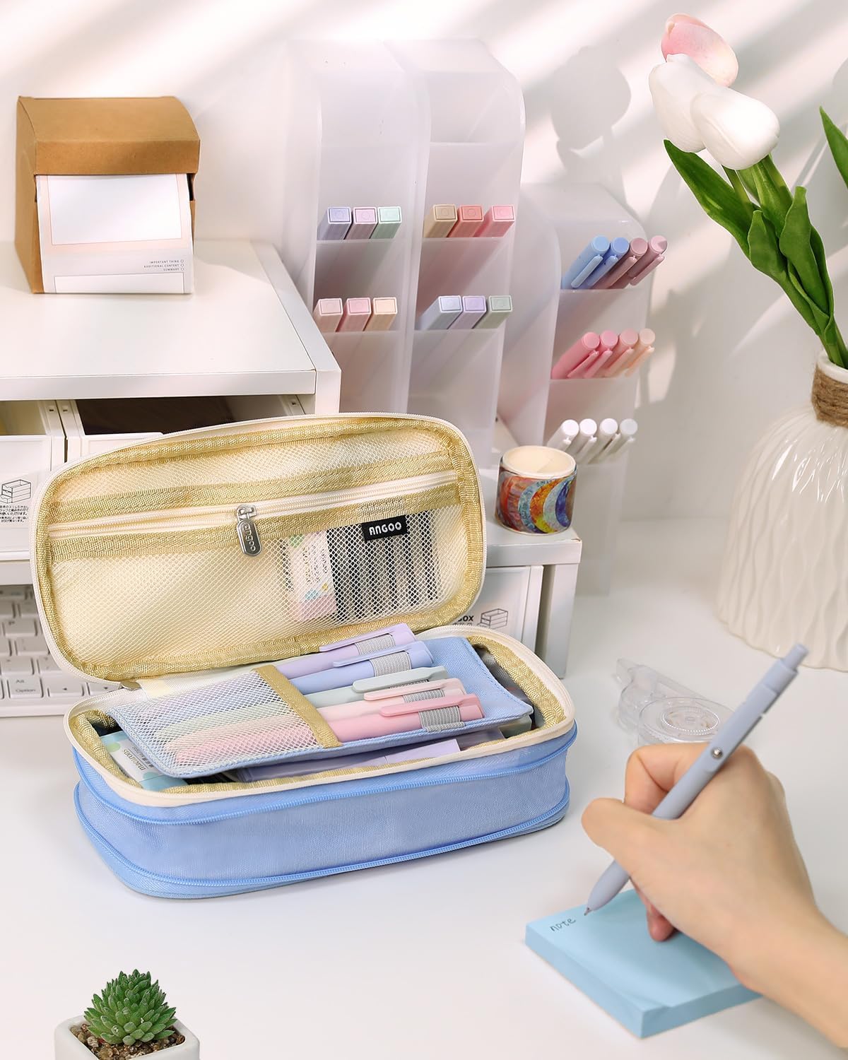 It can store up to 50 pens or 90 pencils and has a mesh pocket for small stationery.